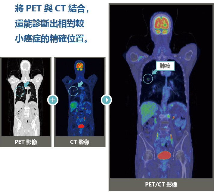 PET/CT是將可將細胞活動狀況與性質化為影像的「PET」(正子放射斷層攝影,Positron Emission Tomography)、與可獲取形態及位置資訊的「CT」(電腦斷層攝影,Computed Tomography)合而為一的檢查設備。一次檢查即可將兩種檢查結果重疊比對,避免因體位誤差導致檢查部位偏移,從而進行精確度更高的影像診斷。對於較難檢測的癌症,還可以結合其他檢查方式,互補各自的不足,進一步提升檢查的準確性。