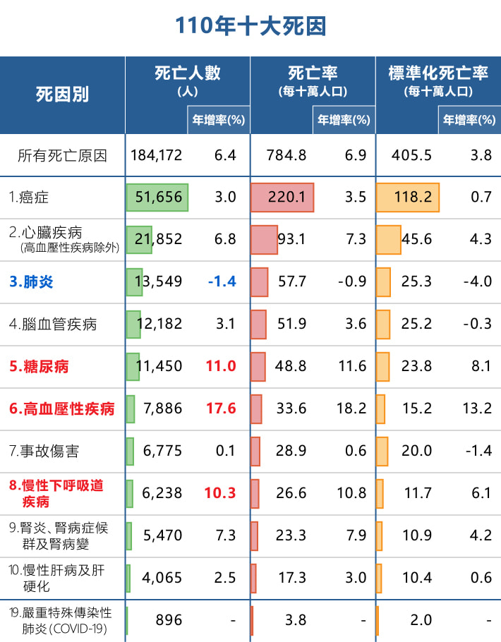 典結腸直腸癌,十大癌症死因中男、女性死亡率差距較大者為口腔癌。